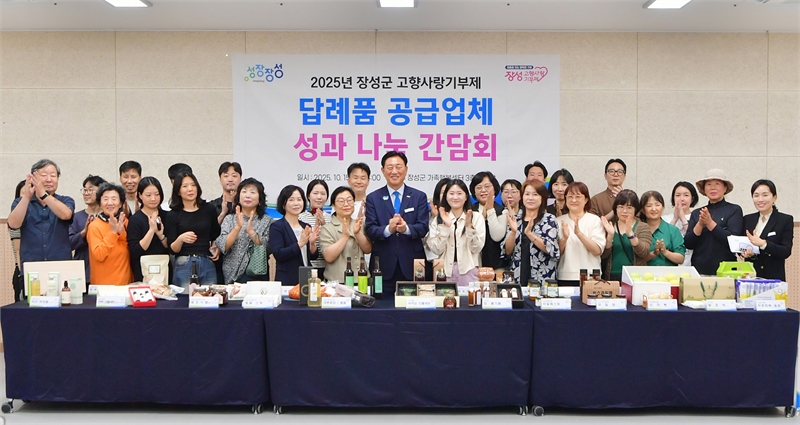 장성군이 고향사랑기부제 답례품 공급업체와 성과를 공유하고 협력 강화를 약속하는 ‘성과 나눔 간담회’를 열었다.이번 간담회는 답례품 공급업체 간 정보 공유와 상생 방안을 모색해 지역경제 활성화를 도모하기 위해 마련됐다. 행사 후 군은 민간 플랫폼 ‘위기브(WeGive)’와 모금 대행 협약을 체결하고, 실무 역량 강화를 위