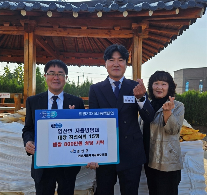 영광군 염산면(면장 김용연)은 11월 7일 열린 제19회 염산면 경로위안잔치에서 자율방범대(대장 강선식)가 햅쌀 5kg 550포(약 800만 원 상당)를 기탁했다고 밝혔다.이날 기탁된 햅쌀은 행사에 참석한 어르신들에게 전달돼 풍성하고 따뜻한 위안잔치를 만드는 데 큰 보탬이 됐다. 염산자율방범대는 매년 경로당 및 ‘나눔 냉